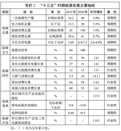 專欄 2 “ 十三五” 時(shí)期能源發(fā)展主要指標(biāo)