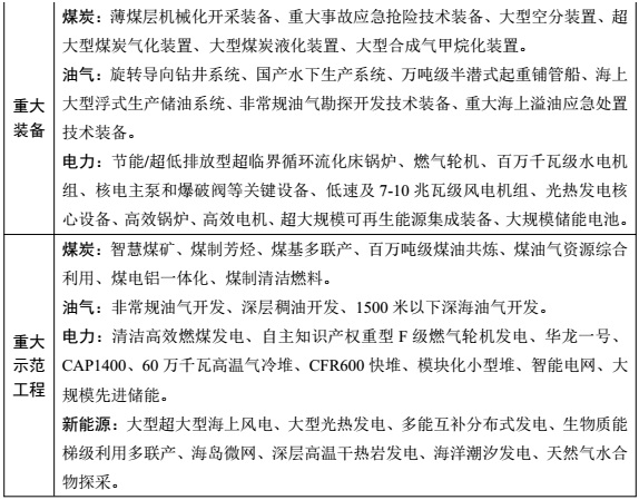加強(qiáng)重點(diǎn)領(lǐng)域能源裝備自主創(chuàng)新, 重點(diǎn)突破能源裝備制造關(guān)鍵技術(shù)、 材料和零部件等瓶頸, 加快形成重大裝備自主成套能力, 推動(dòng)可再生能源上游制造業(yè)加快智能制造升級(jí), 提升全產(chǎn)業(yè)鏈發(fā)展質(zhì)量和效益。實(shí)施科技創(chuàng)新示范工程。 發(fā)揮我國能源市場空間大、 工程實(shí)踐機(jī)會(huì)多的優(yōu)勢(shì), 加大資金、 政策扶持力度, 重點(diǎn)在油氣勘探開發(fā)、 煤炭加工轉(zhuǎn)化、 高效清潔發(fā)電、 新能源開發(fā)利用、 智能電網(wǎng)、 先進(jìn)核電、 大規(guī)模儲(chǔ)能、 柔性直流輸電、 制氫等領(lǐng)域, 建設(shè)一批創(chuàng)新示范工程, 推動(dòng)先進(jìn)產(chǎn)能建設(shè), 提高能源科技自主創(chuàng)新能力和裝備制造國產(chǎn)化水平。