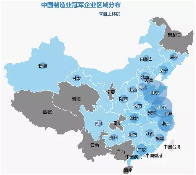 在中國制造業冠軍企業區域分布圖中,灰色地區未有企業入圍冠軍企業,共計9省區,包括廣西、云南、黑龍江、重慶、天津、海南、寧夏、青海、西藏等地,除黑龍江、寧夏外主要分布在西南地區。有入圍企業的省市在圖中用圓圈大小表示冠軍企業數量,山東、江蘇、浙江以22家、18家、13家占據三甲位置,廣東、安徽各有6家企業入選。入選4家企業的有湖北、遼寧、北京。河南、陜西、河北、福建、江西以3家企業緊隨其后。上海、湖南、吉林各有兩家企業入選。有一家冠軍企業的有內蒙古、四川、山西、新疆、甘肅、貴州。