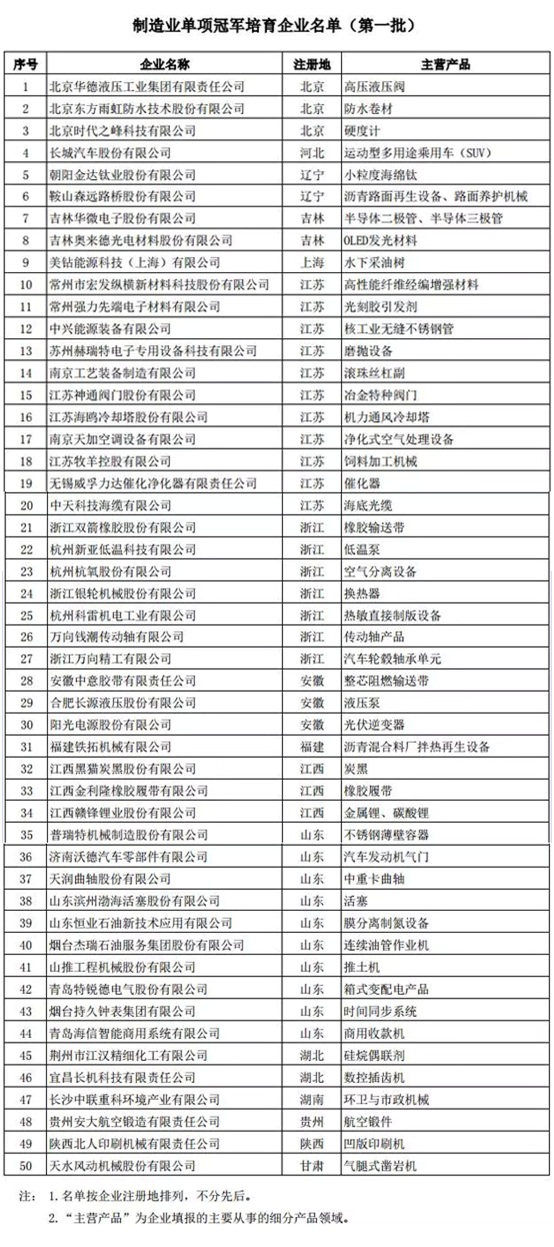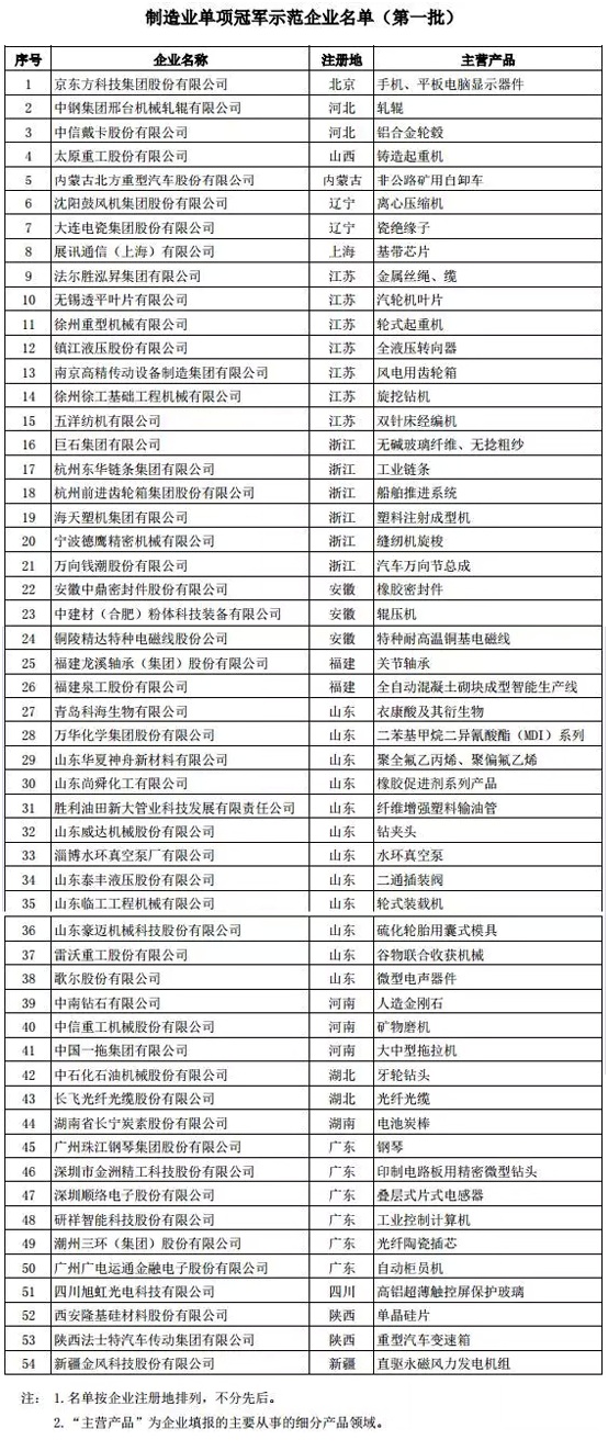 2017年1月17日,工業和信息化部、 中國工業經濟聯合會公布了第一批制造業單項冠軍示范(培育)企業名單。文件明確指出各地工業和信息化主管部門、工業經濟聯合會,有關行業協會要加強對企業的指導和服務,引導和支持企業專注于細分產品領域的創新、產品質量提升和品牌培育,提升國際知名度與競爭力。示范企業要積極采取措施,進一步鞏固其全球地位;培育企業要落實其培育發展方案,力爭盡早發展成為全球領先企業。
