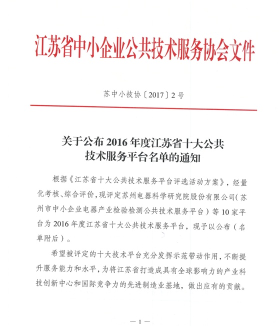 本次活動根據《江蘇省十大公共技術服務平臺評選活動方案》,經量化考核、綜合評價,最終評選出包括蘇州電器科學研究院(蘇州市中小企業電器產業檢驗檢測公共技術服務平臺)在內的10家平臺為2016年度江蘇省十大公共技術服務平臺。