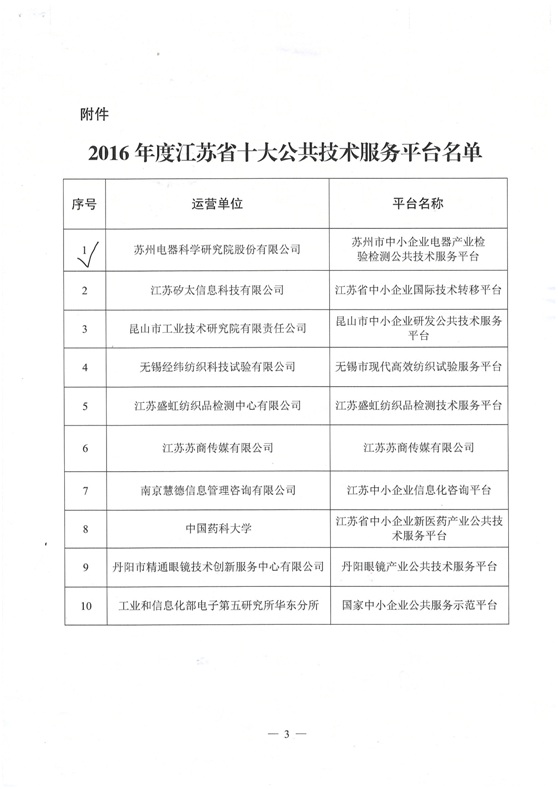 蘇州電科院入選2016年度江蘇省十大公共技術服務平臺
