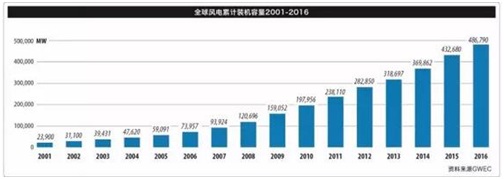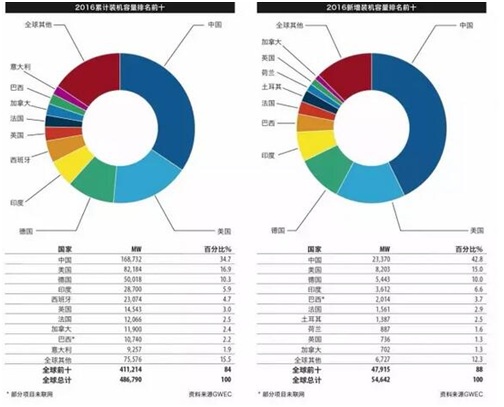 全球風能理事會在印度新德里發布《全球風電報告:年度市場發展》。《報告》顯示,2016年中國風電累計、新增裝機容量均居全球第一。2016 年全球風電新增裝機容量超過 54GW, 其中 9 個國家的裝機容量超過10GW,累計容量達到 486.8GW,累計裝機容量增長 12.6%。