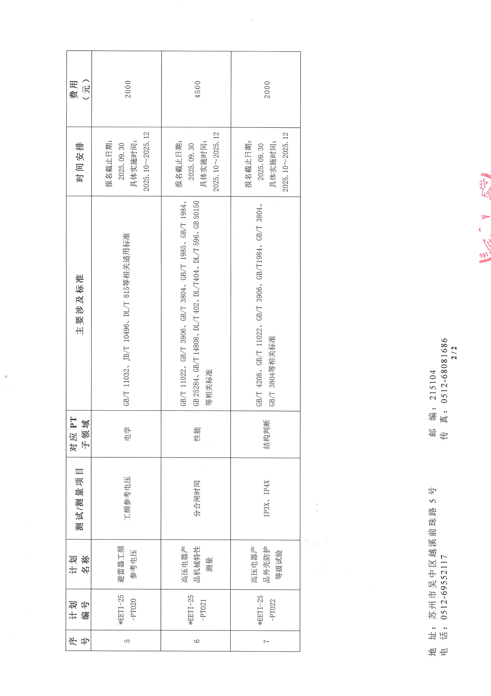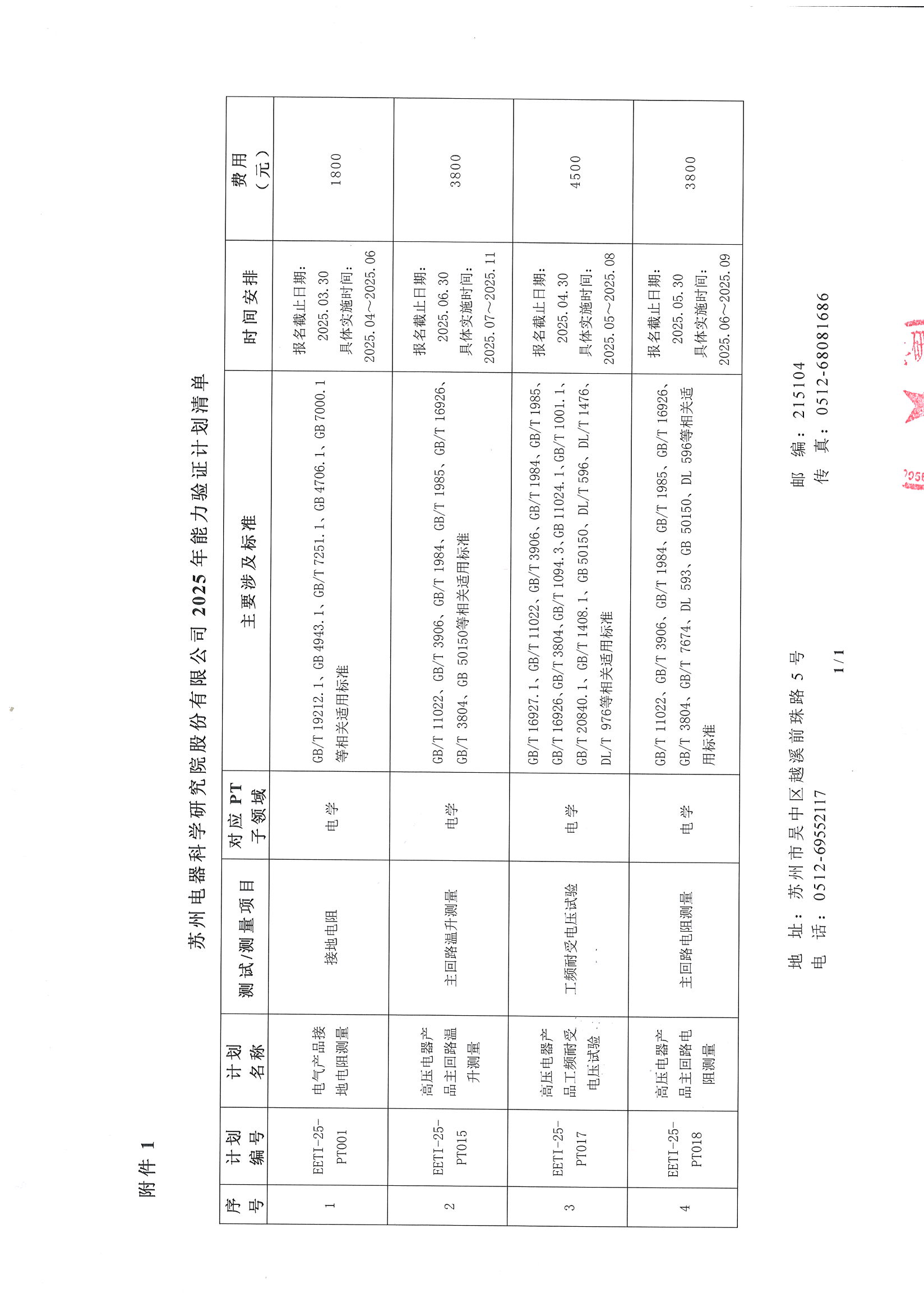 附件1:《蘇州電器科學(xué)研究院股份有限公司2025年能力驗證計劃清單》