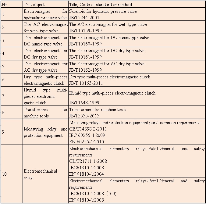 • Machine tool electric apparatus test—According to national standards and industry standards, EETI can manage to do all factory test, type test and periodic test project for the AC and DC solenoids, clutches, control transformers, relays and other electrical machines.